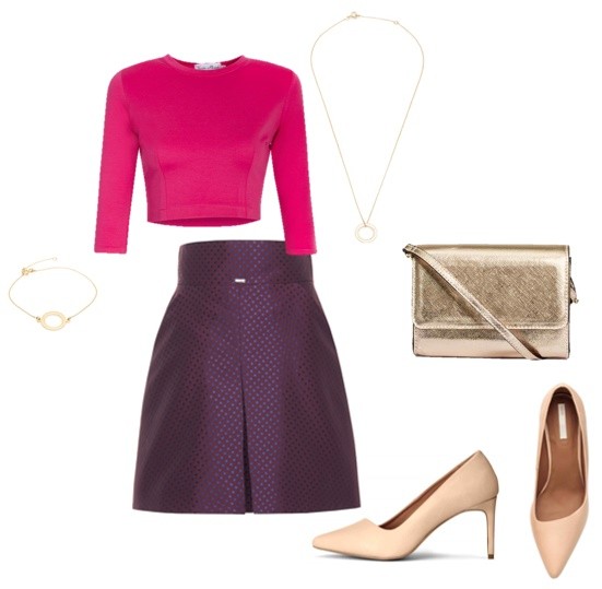 Bluzka Gosia Baczyńska/mostrami.pl, spódnica Kookai/zalando.pl, duża bransoleta Ale./mostrami.pl, małe bransoletki My Way Jewellery/mostrami.pl, torebka Zofia Chylak, buty Casadei/zalado.pl