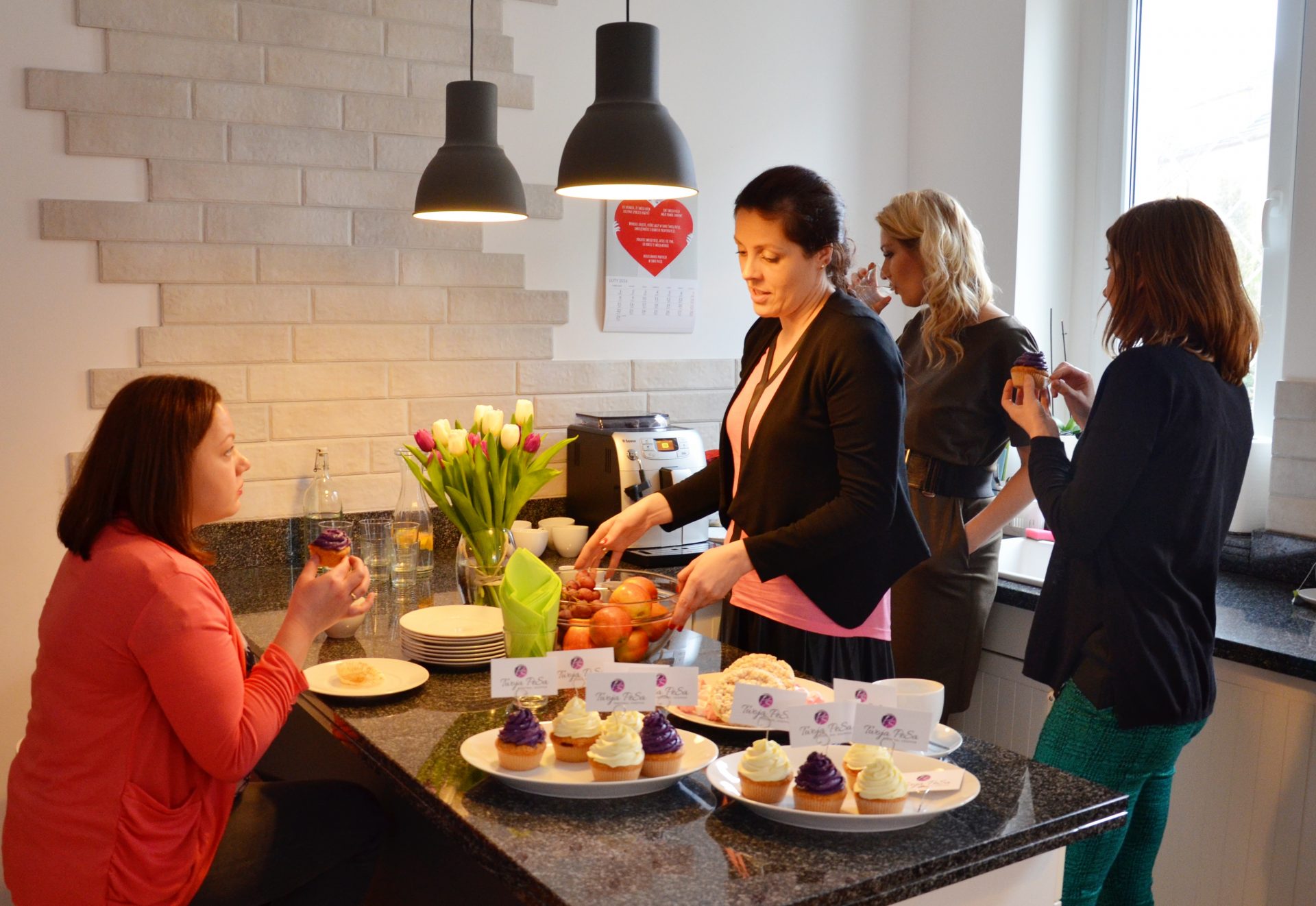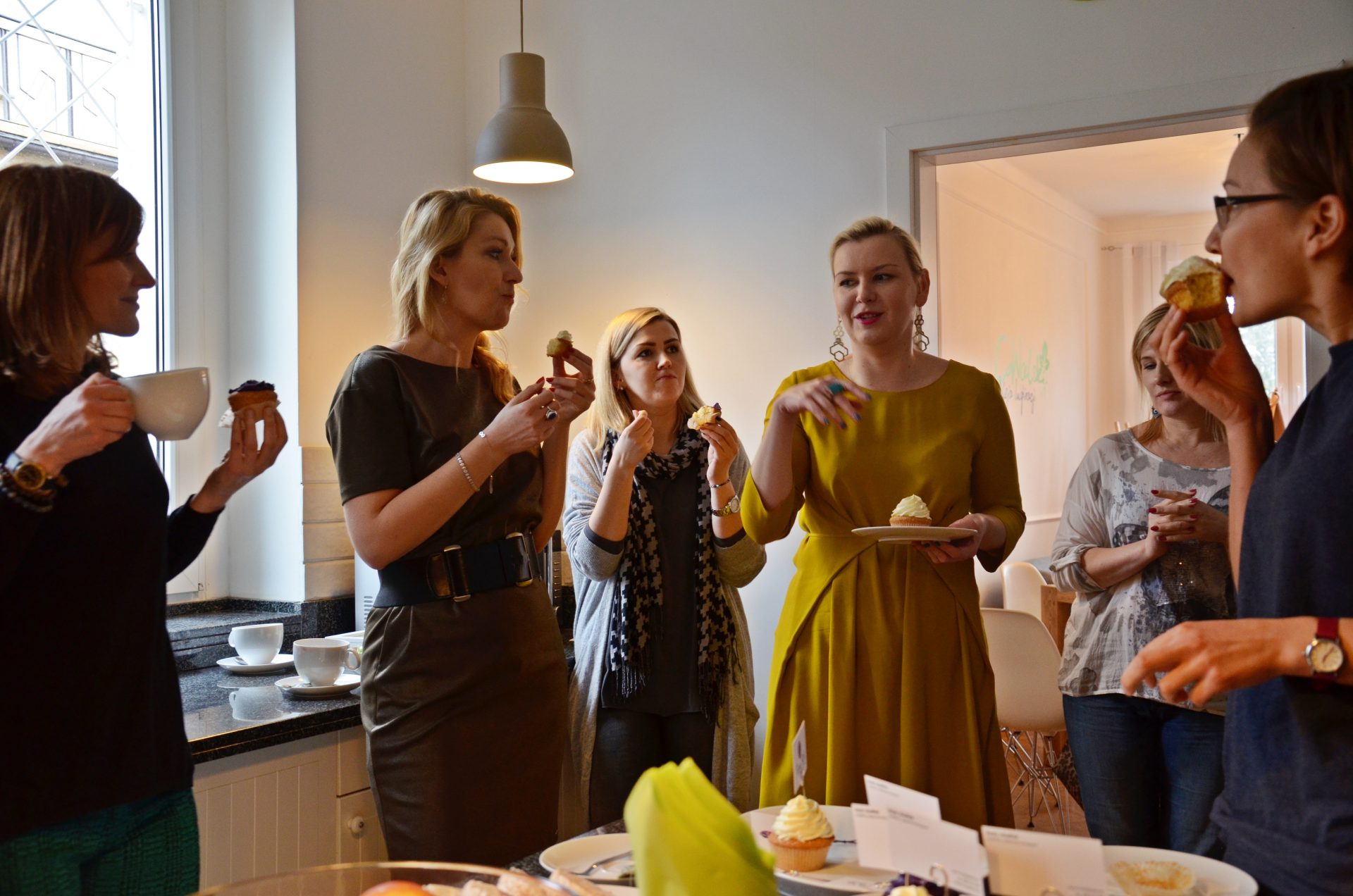 Zaczęłyśmy od tego, by poznać się nawzajem. Dziewczyny (bo to ten moment, w którym z „Pań” przechodzimy na „Ty”) opowiedziały mi, czym się zajmują i jak wyglądają ich garderoby. Rozpiętość zawodowo-wiekowa jak zawsze była spora, ale to w żadnym stopniu nie przeszkodziło nam to, by znaleźć nić porozumienia i swobodnie dzielić się swoimi osobistymi przemyśleniami. Zaczęłyśmy od 7 kroków poszukiwania swojego własnego stylu. Na przykładach wytłumaczyłam, że kolory, fasony, wybrany klimat tworzą całość, która jest komunikatem tego, jakie jesteśmy. Większość z uczestniczek (z nielicznymi wyjątkami) przyznała, że ich szafy są przepełnione, a mimo tego wciąż stają przed dylematami, co na siebie założyć. Omówiłyśmy więc proces przeglądu szafy, by wyselekcjonowana jej zawartość stała się dla nas ideałem, a następnie dodałyśmy do tego przykłady zastosowania jednej rzeczy na wiele sposobów, tak by móc niewielką ilość rzeczy wykorzystywać do maksimum. Rozprawiłyśmy się również z wymówkami zakupowymi, które pchają nas w kierunku nietrafionych zakupów, ponieważ spontaniczne i nieprzemyślane zakupy tym właśnie się kończą. Po omówieniu w teorii i na przykładach kwestii związanych z oswajaniem kolorów oraz łączeniem ich na różne sposoby, zrobiłyśmy sobie krótką przerwę na coś pysznego i choć miała to być chwila oddechu, wciąż dyskutowałyśmy na temat naszych zwyczajów zakupowych.