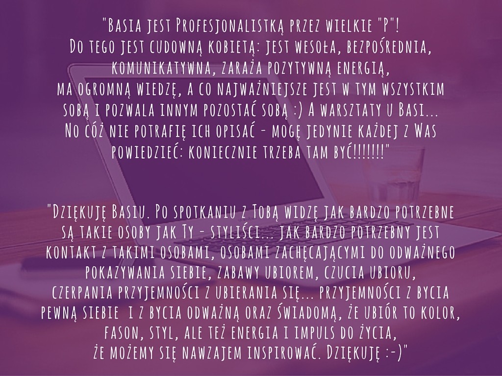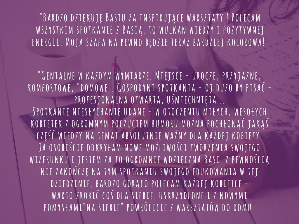 13 lutego, zbliżała się godzina 10. W sali, nad filiżankami aromatycznych kaw, rozlegał się już lekki gwar rozmów powoli zbierających się pań. Przed spotkaniem w mailach od uczestniczek czytałam „Nie mogę się już doczekać”, „Nie ogarniam swojej szafy, więc mam ogromne nadzieje związane z tymi warsztatami”, „Byłam na warsztatach u konkurencji i nie pomogło mi to, stąd pomysł, by spróbować ponownie u Pani”, co dodatkowo podniosło poprzeczkę, którą staram się sobie zawsze stawiać wysoko.